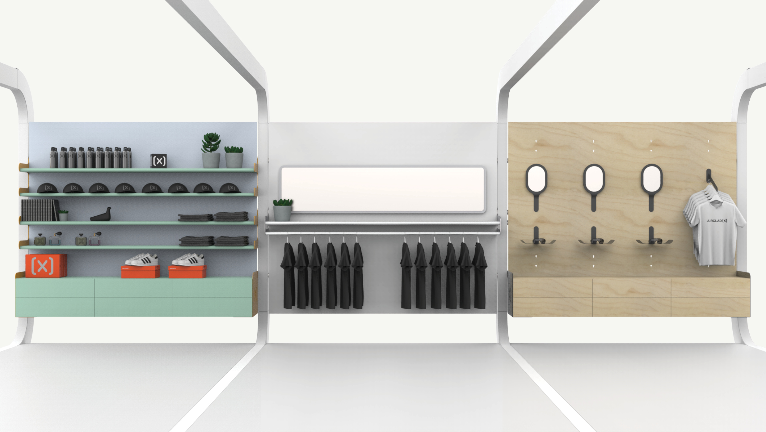 AirClad has worked closely with Visplay to incorporate their shop fit solutions into the world of mobile spaces. Their unique product offering includes a wide a range of accessories with in-built illumination, helping to bring your space to life. A wider range of plug and play shelving, storage and accessories are available on request.